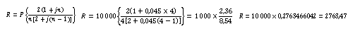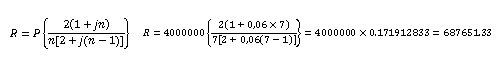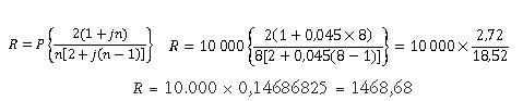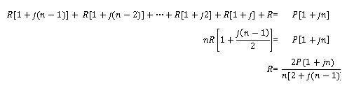 Si se asume que el préstamo P se concede para amortizarse con interés simple y n cuotas uniformes periódicas R que devengan una tasa nominal j, puede plantearse una ecuación de equivalencia financiera con fecha focal en el momento n y despejarse R del siguiente modo: