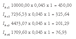 Por ejemplo, el interés de la cuota 1 y de la cuota 2, cuando k=1 y k=2, se tiene: