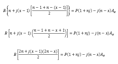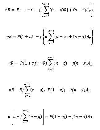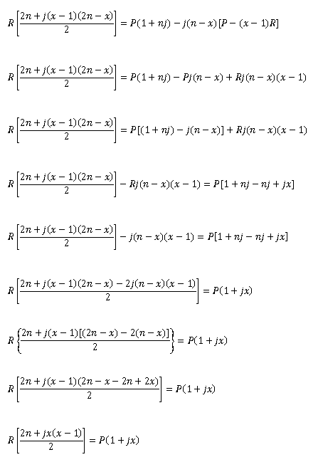 En la x-ésima cuota se cancela el principal. Por lo tanto, Ax será igual a P menos la suma de todas las amortizaciones de principal anteriores. Téngase presente que en todas las cuotas anteriores se amortizaba principal y no se rebajaba interés. Por lo tanto, cada una de las amortizaciones de principal anteriores son iguales a R y Ax = P - (x-1) R. Se cumplen entonces las siguientes igualdades: