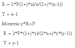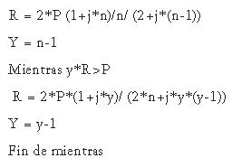A partir de la precondición {n es entero positivo; p es positivo; j es positivo} este algoritmo deja en y el número de cuotas amortizaciones uniformes, en R el valor de la cuota uniforme. El algoritmo anterior ha sido sistematizado en la función financiera personalizada Rsim1 (cuota uniforme con interés simple) del complemento Herramientas financieras personalizadas de Excel.