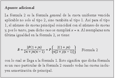 En el presente caso solo las n-1 primeras cuotas se destinan a amortizar principal, mientras que en la penúltima y última cuota se pagan intereses. Sin embargo, con cuotas uniformes de 1 468,68 um cada una, importe calculado con la fórmula 1, no alcanza para cancelar el interés devengado durante el préstamo, que asciende a 1 762,10 um, y deja pendiente por cancelar 12,63 um de saldo insoluto de interés simple. Queda ilustrado entonces que, en este ejemplo, la aplicación de la fórmula 1 no obtiene el verdadero importe de la cuota uniforme.