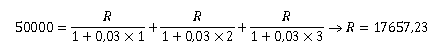 Zans (2004, pp. 87-89) plantea que la cuota uniforme se obtiene luego de establecer una ecuación que es supuestamente de equivalencia financiera en el presente (momento 0). Así, para obtener la cuota uniforme de un préstamo de 50000 um, que devenga una tasa de interés simple mensual de 0,03 y se cancela con tres cuotas uniformes mensuales, formula el siguiente cálculo: