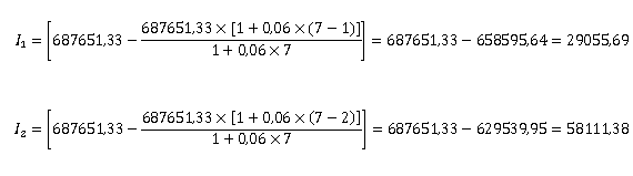 Por su parte, Cabeza de Vergara (2010, pp. 158-175), en su informe Cavilaciones sobre el interés simple, plantea el siguiente problema: "Se realiza un préstamo de $4000000 y se pacta cancelarlo en siete cuotas iguales, a una tasa de interés de 6 % semestral, bajo la modalidad del interés simple. Se desea calcular el valor de la cuota y construir una matriz de pago que muestre cómo se distribuye la cuota entre intereses y abonos a capital y luego compare el presente de cada cuota con el presente de una anualidad vencida, interés simple". Después de calcular la cuota uniforme con la fórmula 1, plantea la siguiente solución.