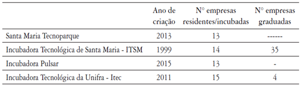 As unidades de análise deste artigo são os ambientes de inovação da cida de de Santa Maria, sendo caracterizados e delimitados por Parques Tecno lógicos e Incubadoras Tecnológicas. Especificamente, foram pesquisados o Santa Maria Tecnoparque, a Incubadora Tecnológica de Santa Maria (ITSM), a Incubadora Pulsar e a Incubadora Tecnológica da Unifra (Itec).