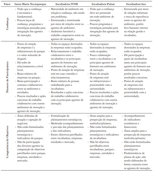 Com relação à questão da confiança nos ambientes de inovação de Santa Maria, perceberam-se relações moderadas para fracas visto que os entre vistados destacaram o papel da confiança e que deve ser permeada por todo o ambiente, porém verificaram-se poucas estratégias e programas pensados para a integração dos agentes do ambiente de inovação, princi palmente tratando-se de empresas que atuam em segmentos semelhantes e que podem ter certa concorrência. Dessa forma, as relações estão mais estruturadas em âmbito interno de cada ambiente de inovação. Como exceção, a Incubadora Tecnológica de Santa Maria destacou uma maturi dade da incubadora referente à questão da confiança, algo já ultrapassado por esse ambiente de inovação a nível interno do ambiente, sendo um local favorável a relações de trabalho conjunto entre as empresas e incu bados, porém ainda há poucas estratégias e programas pensados para a integração dos agentes do ambiente de inovação.
