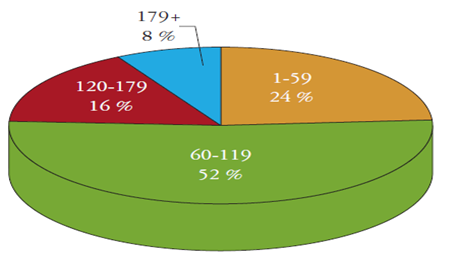 La figura 2 presenta la cantidad de artículos disponibles para el periodo 2011-2016. Un 24 % de las revistas tenían publicados menos de 60 artí culos, un 52 % entre 60 y 119 artículos durante el periodo en considera ción, un 16 % entre 120 y 179 artículos y solo 3 revistas publicaron 179 artículos o más, que representan un 8 % del total de las revistas.
