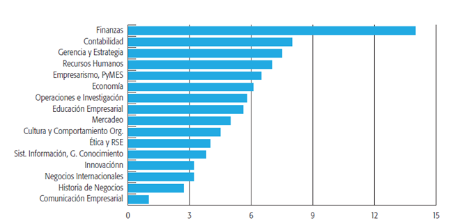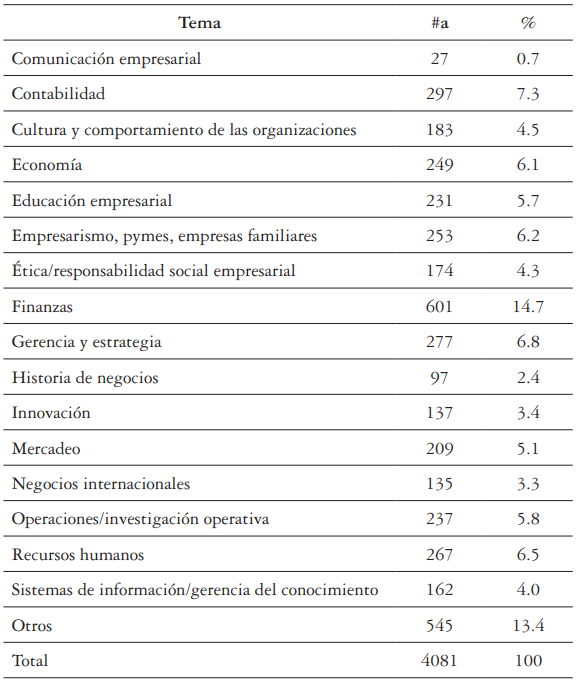 La tabla 2 provee el número de clasificaciones por tema y el porcentaje que esto representa (que incluye la clasificación de otros). La figura 3 presenta los porcentajes sobre el total de manera ordenada. Se observa que el tema del que más se publica es finanzas, que es el doble del siguiente tema (con tabilidad). Estos dos temas, los cuales están entrelazados significativamen te, representan un 22 % de las clasificaciones (898 artículos tienen como tema principal finanzas o contabilidad). Los temas de menor cantidad de clasificaciones son historia de los negocios y comunicación empresarial, el último con menos del 1 % (27 artículos clasificados bajo este renglón).