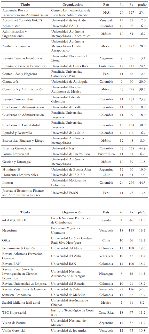 La selección de las revistas se fundamentó inicialmente en listas genera das por el catálogo de revistas de Latindex. Esta base de datos utiliza una amplia gama de criterios de calidad en la evaluación de las revistas para la inclusión en su catálogo (Penkova, 2011). Se escogieron las revistas incluidas bajo el tema ciencias sociales y los subtemas administración y economía de la empresa, contabilidad y finanzas. A esta lista se añadieron revistas que aparecen en los estudios de Ruiz, Penkova y Villafañe (2012) y Olivarietta (2016), por ser los únicos estudios que en su momento pro veían una evaluación externa de la familiaridad y calidad de revistas lati noamericanas en la disciplina de administración de empresas. La combi nación de estas listas y estudios resultó en una relación de 114 revistas. Un punto relevante es que múltiples revistas estaban en todas las listas (en los tres subtemas de Latindex y en los dos artículos de investigación), pero, inversamente, algunas solo estaban en una de estas fuentes.