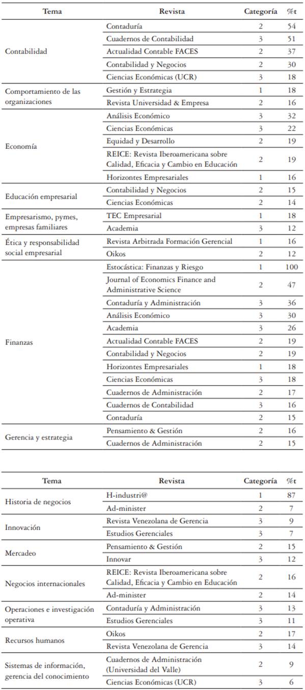 Se observa que solo tres de los temas (contabilidad, economía y finanzas) tienen más de dos revistas con porcentajes sobre 15 % y que en múltiples temas, solo una o ninguna revista alcanzó el valor de 15 %. Además, se observa en los resultados de la tabla 3 que 8 de las 9 revistas de la cate goría 3 están representadas en estos resultados. Esto era de esperarse, ya que las revistas de esta categoría tienen la capacidad de concentrarse en temas específicos. Es importante recalcar que existen en América Latina múltiples revistas de investigación cuyo enfoque es la economía y que no fueron incluidas en este estudio, las cuales posiblemente tengan porcen tajes por encima del 75 % para ese tema en particular.