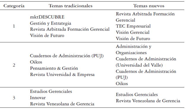 Como una caracterización agregada de las revistas, se definen estas por su porcentaje de publicación en dos grupos temáticos asociados con la admi nistración de empresas: 1) temas “tradicionales” de la administración de empresas como mercadeo, operaciones/investigación operativa, recursos humanos y gerencia/estrategia, y 2) temas “nuevos” de la administración de empresas como empresarismo/pymes/empresas familiares, ética/RSE, innovación y sistemas de información/gerencia de conocimiento. Esta clasificación fue desarrollada por los autores basándose en la evolución de cursos y programas académicos en el campo de la administración de em presas. Por ejemplo, hace treinta años el número de cursos y programas en los temas denominados “nuevos” era mínimo o posiblemente ninguno en gran parte de los programas de administración de empresas, y la gran mayoría eran cursos y programas en los temas denominados “tradiciona les”. Hoy en día, se ofrecen múltiples cursos y programas en los temas denominados “nuevos”.