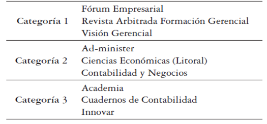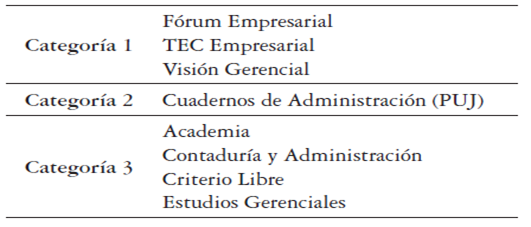 Palabras clave: clasificaciónclasificación,revistasrevistas,investigacióninvestigación,administración de empresasadministración de empresas.