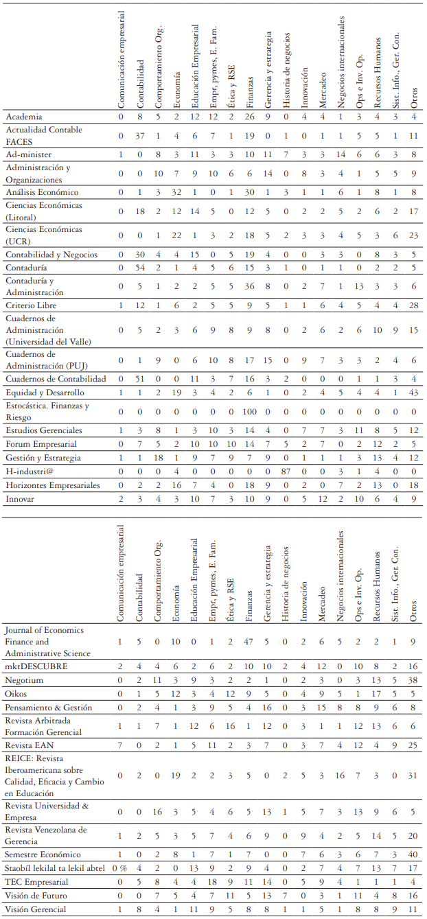 Esta investigación presenta un enfoque novedoso de considerar revistas de publicación y distribución de conocimiento. La novedad proviene en caracterizar las revistas por tema, algo importante dado que, a diferencia de las revistas publicadas en inglés, la mayoría de las revistas latinoameri canas en el campo de la administración de empresas son consideras gene ralistas, publicando artículos en cualquier tema del campo. Este estudio demuestra que múltiples revistas no son siempre generalistas, y que por selección o aleatoriamente, sus publicaciones hacen hincapié en ciertas áreas de empresas o en temas considerados por los autores como nuevos. Esta información facilita al investigador elegir la publicación más ade cuada según sus circunstancias propias y las características de la investi gación. Ahorra tiempo, evita frustraciones y claramente contribuye a la calidad de la revista.
