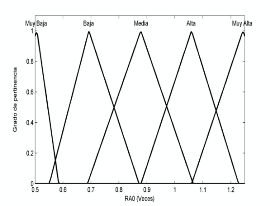 El indicador RAO no es el problema en las empresas en estudio. Solo el 33 % de las empresas en estudio obtienen niveles de rotación por debajo de 0.60. Los conjuntos difusos para este indicador fueron ubicados en el rango 0.5-1.2. Aunque existen valores de rotación mayores de 1.2, el modelo in mediatamente los reconoce como valores altos. Se establecen cinco niveles de respuesta: muy bajo, bajo, medio, alto y muy alto (véase figura 2).