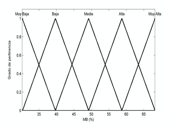 El indicador MB constituye el problema fundamental de las empresas en estudio. El 72 % del total de la muestra presentan niveles de márgenes por debajo del 40 %. Los conjuntos difusos para este indicador fueron ubicados en el rango 0-65. Algunas de las empresas de la muestra pueden obtener márgenes por encima del 65 %, los cuales son reconocidos por el modelo como niveles muy altos. Se establecen cinco niveles de respuesta: muy bajo, bajo, medio, alto y muy alto (véase figura 3).