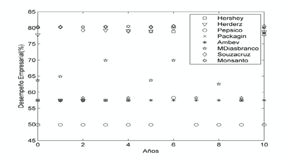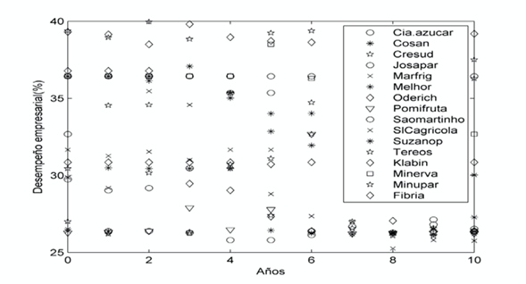 Se observó que Brasil muestra una clara tendencia negativa en los últimos tres años, con igual tendencia en intervalos del periodo en estudio. Este mismo país tiene una destacada proporción de empresas organizadas en el grupo de menor desempeño, seguido de Argentina. En sentido contra rio, se destacan los Estados Unidos con manifestación de total coherencia en los dos aspectos analizados. Estos elementos sugieren la existencia de relaciones entre comportamiento del desempeño y su impacto en indica dores considerados para evaluar el crecimiento económico.