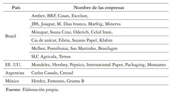 Para el desarrollo de la investigación, se utilizaron los datos correspon dientes a indicadores del periodo 2005-2015 de empresas pertenecientes al sector de agronegocio de Brasil y de empresas del mismo sector de países cuya representación en Econométrica sea de al menos dos empresas. La muestra quedó como se muestra en la tabla 1.