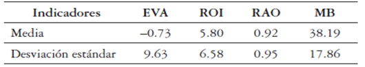 El valor medio del ROI (5.80) y su desviación estándar (6.58) hablan a fa vor de niveles bajos en la mayoría de las empresas estudiadas; un análisis de los valores reflejados por los factores internos del desempeño, MB y RAO, revela que existe un mayor peso de las observaciones con bajo margen; mientras que el RAO tiende a mejores y más estables comportamientos.