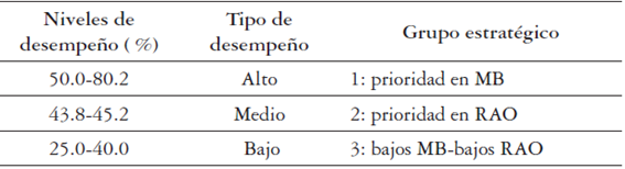 Basados en la teoría de los conjuntos fuzzy, el nivel de desempeño asume valores alto, medio y bajo. La clasificación de las empresas de acuerdo con su nivel de desempeño está determinada por el comportamiento que en cada caso asumen las variables de entrada. Cada grupo de empresa manifies ta una característica en común y que lo diferencia del resto de los grupos, lo cual permitió clasificarlos por grupos estratégicos. El comportamiento que ha caracterizado a las empresas se puede observar en la tabla 5.