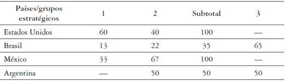 Se destacan los Estados Unidos, el 100 % de las empresas estudiadas es tán ubicadas en los grupos 1 y 2, con el mayor porcentaje de sus empresas organizadas en el grupo de alto desempeño económico. En la secuencia, las empresas de México, cuya representatividad es del 33 y el 67 % de las empresas organizadas en los grupos 1 y 2, respectivamente.