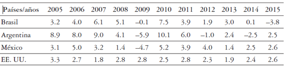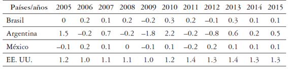 La tasa de crecimiento del PIB de los Estados Unidos muestra mayor es tabilidad durante el periodo estudiado, con algunas disminuciones brus cas ocurridas en 2007 y 2013; junto con México, muestra los mejores resultados en 2015, este último con una mayor inestabilidad a lo largo del periodo en estudio, con una tendencia a crecer durante los últimos tres años. Argentina y Brasil exhiben las tasas de crecimiento más bajas, revirtiendo Argentina el decrecimiento de 2014 en un crecimiento para 2015. Al contrario, Brasil no logra una tasa de crecimiento positiva en 2015, por lo cual exhibe los resultados más desfavorables.