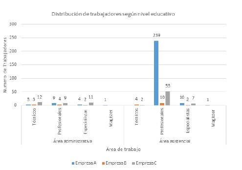 En el estudio participaron tres empresas de rehabilitación física del sector privado, con una media de antigüedad de 20 años (+/- 5); los encargados de responder el cuestionario fueron el gerente (33,3%; n = 1), y el director de calidad (66,6%; n = 2). El tipo de empresas varío según el tamaño de la población: Empresa A (grande): 250 trabajadores; Empresa B (pequeña): 23 trabajadores; y Empresa C (mediana): 85 trabajadores. Las características de la población fueron similares en las tres empresas, presentándose variación en la cualificación académica del personal asis-tencial y administrativo (véase la figura 1).