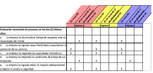 En lo relacionado con la innovación de procesos, solo la Empresa B (pequeña) manifestó estar de acuerdo con los ítems evaluados, en tanto que las otras dos empresas se mantuvieron neutrales ante la pregunta de si en los dos últimos años se habían mejorado las condiciones de trabajo; la Empresa A (grande) se mostró neutral en los tiempos de respuesta con respecto a la necesidad del cliente (véase la figura 3).