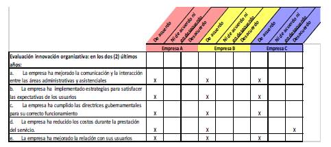 En relación con la innovación organizativa, una de las empresas estudiadas establece que no se han disminuido sus costos durante la prestación de los servicios, lo cual se convierte en una oportunidad de desarrollar sobre esta una estrategia innovadora que le permita a esta organización implementar los cambios necesarios para lograr su objetivo de disminuirlos. Los métodos de dirección enfocados al desarrollo de la innovación en los que actividades como, por ejemplo, la planeación estratégica, así como los sistemas de gestión de la calidad, permiten a la organización desarrollar innovación en sus servicios, garantizan una mejor relación con los clientes al permitir los cambios que sean necesarios desde el punto de vista de la innovación orga-nizacional. De igual forma, en los procesos de gestión del recurso humanos dentro de la organización deben estar identificados y reflejar la selección, la capacitación y los incentivos en cada una de las personas que pertenecen a la organización (Arraut, 2008).
