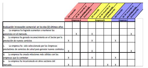 El ítem de innovación comercial fue el que mostró mayor variación en las tres empresas. Llamó la atención que la Empresa C (mediana) evidenció que no habían logrado mantener sus ganancias en el mercado y tampoco habían logrado ser seleccionadas por las EPS para generar nuevos contratos (véase la figura 5).