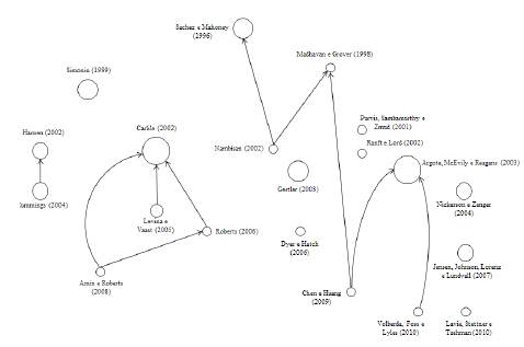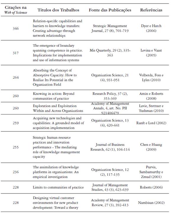 O trabalho de Carlile (2002) foi citado por Amim & Roberts (2008), por Roberts (2006) e por Levina & Vaast (2005). Da mesma forma, o trabalho de Argote, McEvily & Reagans (2003) foi citado por Volberda, Foss & Lyles (2010) e por Chen & Huang (2009). Estes artigos, pela representatividade do círculo e das citações, são referências principais de outros que também recebem grande quantidade de citações. Os demais estudos ou não apresentaram conexão de citações ou são menos citados no grupo. As quantidades de citações recebidas e as principais informações de referências destes trabalhos estão listadas na Tabela 5.