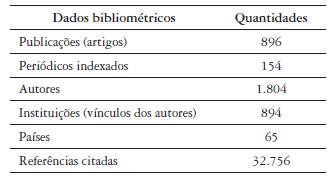 Após o levantamento dos dados bibliométricos na principal coleção do Web of Science com os termos sinalizados na seção anterior, foram identificados 896 artigos sobre o gerenciamento do conhecimento para a inovação. Estes artigos estão publicados em 154 periódicos indexados à base de dados em questão e foram escritos por 1.804 autores que possuem vínculos com 894 instituições de ensino localizadas em 65 países. No levantamento também foi possível perceber que os artigos selecionados foram elaborados com um conjunto de 32.756 referências, com uma média de aproximadamente 36 referências por artigo. Na Tabela 1, a seguir, são apresentados esses resultados.