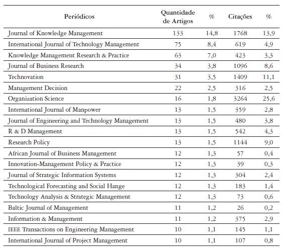 A Tabela 2 identifica os periódicos internacionais mais representativos quanto à quantidade de artigos publicados e de citações para a temática do gerenciamento do conhecimento para a inovação. Foram analisados os 154 periódicos indexados na Web of Science em relação à quantidade de artigos publicados sobre as temáticas e o total de citações na base de dados. Tem-se que o top 20 de periódicos corresponde a 528 publicações que representam aproximadamente 75% da quantidade total de trabalhos identificados. O periódico com maior número de publicações é o Journal of Knowledge Management com 133 publicações. Este tipo de indicador pode apresentar utilidade para futuras pesquisas e funcionar como um sinalizador de periódicos base sobre o assunto.