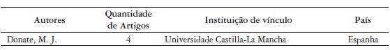 Após análise dos periódicos, foram identificados os autores que possuem maior quantidade de registros de publicações sobre as questões. A Tabela 3 apresenta a listagem com o nome desses autores, a quantidade de artigos publicados, o vínculo institucional e o país de origem da instituição. Foram selecionados os 20 autores com a maior quantidade de registros. Entre os autores com mais publicações sobre o tema, destacam-se Aino Kianto, que trabalha na instituição de vínculo citada na Tabela 3 com oito publicações, e Jie Yang que atualmente atua na Universidade de Houston-Victoria (Texas), com sete artigos. Também se pôde perceber que a maior quantidade de trabalhos publicados tem origem no continente europeu, com destaque para a Espanha.