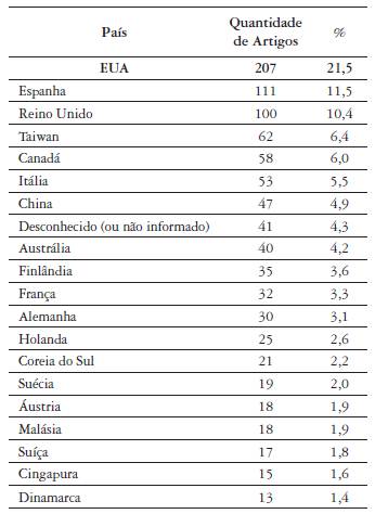 Para visualizar a representatividade dos países de origem das instituições de vínculo dos 1.804 autores das 896 publicações mapeadas neste levantamento bibliométrico, foi identificado o top 20 dos países com mais produção científica nas temáticas, que podem ser observados na Tabela 4, com destaque para o funcionalismo americano, berço das pesquisas sobre o gerenciamento do conhecimento.