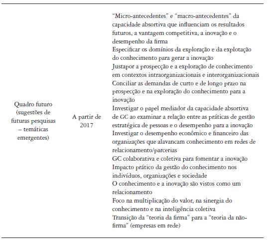 As temáticas emergentes identificadas nos principais manuscritos versam sobre as variáveis intraorganizacionais e interorganizacionais que impactam na capacidade absortiva e na prospecção, exploração e explotação do conhecimento e que podem influenciar as demandas de curto e longo prazos, a vantagem competitiva, a inovação e o desempenho econômico e financeiro das organizações no mercado. Além disso, tratam ainda sobre a necessidade de estudos futuros sobre a GC e sobre a inovação no contexto de redes colaborativas de relacionamento entre indivíduos, organizações e a sociedade para a multiplicação de valor por meio da inteligência competitiva.