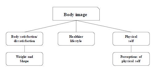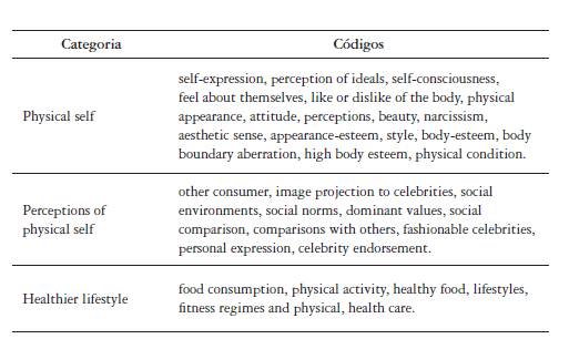 As categorias identificadas podem ser descritas da seguinte forma: a) Body image: refere-se à imagem corporal e foi identificado como principal categoria ou categoria primária; Body satisfactionldissatisfaction: refere-se à forma como o indivíduo se relaciona com sua figura corporal demonstrando satisfação ou insatisfação com o que percebe; Weight and shape: relativo ao peso corporal e à forma que a silhueta possui em relação ao peso; Physical self: esta dimensão está relacionada à autopercepção do indivíduo e às projeções que o indivíduo faz do seu corpo em relação à figura eu, ideal e saudável; Perceptions of physical self: são as percepções das outras pessoas e as projeções do indivíduo na figura que represente o estereótipo ao qual pretende atender; Healthier lifestyle: descreve a percepção de um corpo e de um estilo de vida saudável a partir da figura eu.