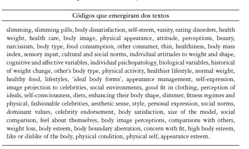 Na presente seção, os dados receberam tratamento analítico e inicialmente se encontrou o termo central em uma leitura prévia da literatura (body image). Em seguida, fez-se uma busca na base de dados de artigos relacionados ao termo central e, após, fez-se uma leitura flutuante dos textos. Por fim, realizou-se a codificação de forma a construir uma hierarquia de códigos que representassem a associação ao termo central. O processo de codificação e categorização desses artigos possibilitou identificar um conjunto de códigos que se referiam ao tema central e que resultaram nas seguintes categorias secundárias: Body satisfactionldissatisfaction; Weight and shape; Physical self; Perceptions of physical self; Healthier lifestyle. As etapas para se chegar a estes resultados foram descritas nas próximas seções.