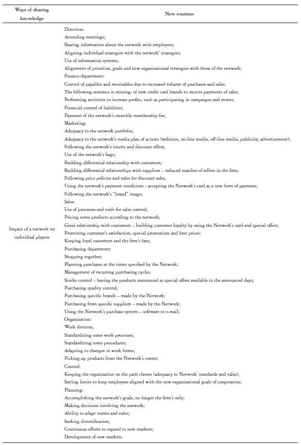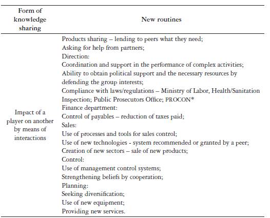 The results are presented in Table 3, where the ways proposed to share knowledge within the network and the resulting routines from these interactions are identified. All changes made in processes, norms, rules, systems, equipment, standards, layout, etc. were analyzed in the ten cases. Based on these results, the new organizational routines adopted by the firms were compiled.