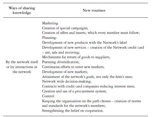 Many routines developed by the firms as a result of the common knowledge produced come from network's demands and directives. This happens because many processes created jointly will eventually become rules to be followed by everyone. As an example, we have the routines mentioned earlier, about campaigns created by the network or resulting from weekly offers or inserts, which are also created jointly and must be followed by the firms. Collectively, the firms succeeded in contracting credit card companies with significant reductions in interest rates, with significant increases of the businesses' financial returns. The knowledge of some partners, along with the negotiation power of others, yielded new possibilities for the firms, resulting in more gains for all associates. In some firms, the reduced credit card interest rates allowed for investments in sectors that need improvements.