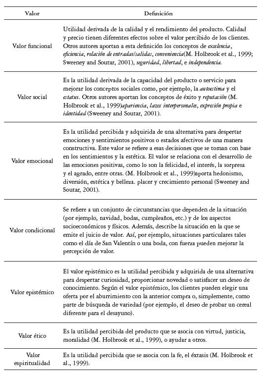 Asimismo, en la literatura revisada se logran identificar siete dimensiones del valor percibido: "Valor funcional", "Valor social", "Valor emocional", "Valor epistémico", "Valor condicional", "Valor ético" y "Valor espiritual", resultado de las recopilaciones realizadas por Valdéz (2013) y Aragón (2013), las cuales se exponen a continuación en la tabla 1 con las definiciones realizadas por diversos autores, entre los que se encuentran ), Sweeney y Soutar (2001 y Zeithaml (1988).