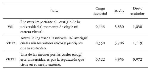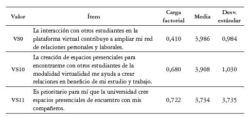A partir de esto se encontró que 10 dimensiones explican el 63,15 % de la varianza. Estas dimensiones son: "Valor ético-condicional", "Valor socioemocional", "Valor funcional", "Valor epistémico", "Valor condicional", "Valor social", "Valor espiritual", "Valor ético funcional", "Valor ético social", "Valor sociocondicional", y "Valor ético espiritual". Como se aprecia en la tabla 3, la dimensión número 1 se ha denominado "Valor ético condicional" y agrupa 25 ítems, entre los cuales se destacan: "contar una plataforma virtual amigable"; "que la universidad respete la libertad de credo", y "el aporte significativo que el estudiante cree le hará a la sociedad al momento de culminar sus estudios".