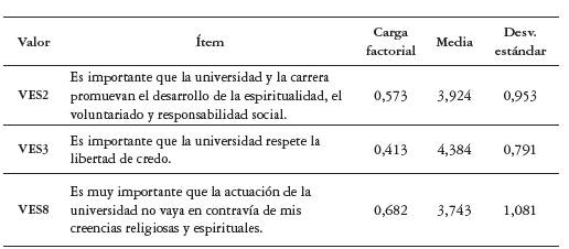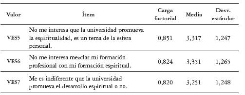 La dimensión número 6, la cual se denomina "Valor espiritual", permite suponer -de acuerdo con la saturación de categorías de la fase cualitativa para este valor (véase la figura 1)- que el concepto de espiritualidad lo identifican los estudiantes con religiosidad. El ítem "No me interesa mezclar mi formación profesional con mi formación espiritual", incluido en la escala a evaluar, surge de la entrevista semiestructurada en la que los estudiantes dejan entrever un rechazo a que la institución de educación superior incluya prácticas o cursos de formación espiritual, de manera que relacionan lo espiritual más con una forma de intromisión en la vida religiosa del alumno que con prácticas o proyectos para fomentar el crecimiento personal o el desarrollo del ser, actividades propias del quehacer universitario (véase la tabla 10). Este tema deberá tratarse con más profundidad al interior de la IES, dado que los lineamientos de la política de educación superior inclusiva (MEN, 2013) plantean todo un trabajo por desarrollar en la comunidad académica universitaria tendiente a garantizar el cumplimiento de las premisas de participación, pertinencia y diversidad que se relacionan directamente con el valor espiritual, la calidad, la equidad y la interculturalidad.