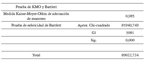 Se analizaron los supuestos previos de normalidad, heterocedasticidad y multicolinealidad, y se obtuvo ausencia de normalidad, no heterocedas-ticidad, y algún grado de multicolinealidad. Después se llevó a cabo la prueba de KMO y de esfericidad de Bartlett, cuyos resultados se presentan en la tabla 2. Igualmente, se analizó la adecuación individual a partir la matriz de correlaciones antiimagen, lo que permite verificar la viabilidad de ejecutar el análisis factorial confirmatorio. A fin de determinar la fiabilidad se aplicó el alfa de Conbrach a 83 elementos de la escala, y se obtuvo un resultado de 0,978, lo que garantiza la consistencia y la estabilidad del instrumento.