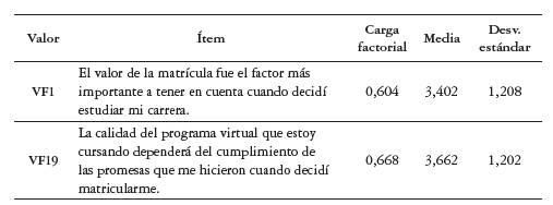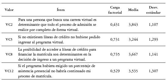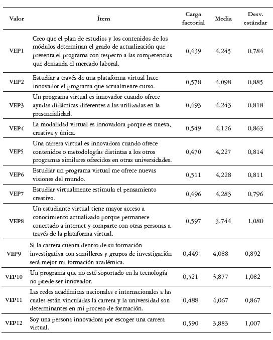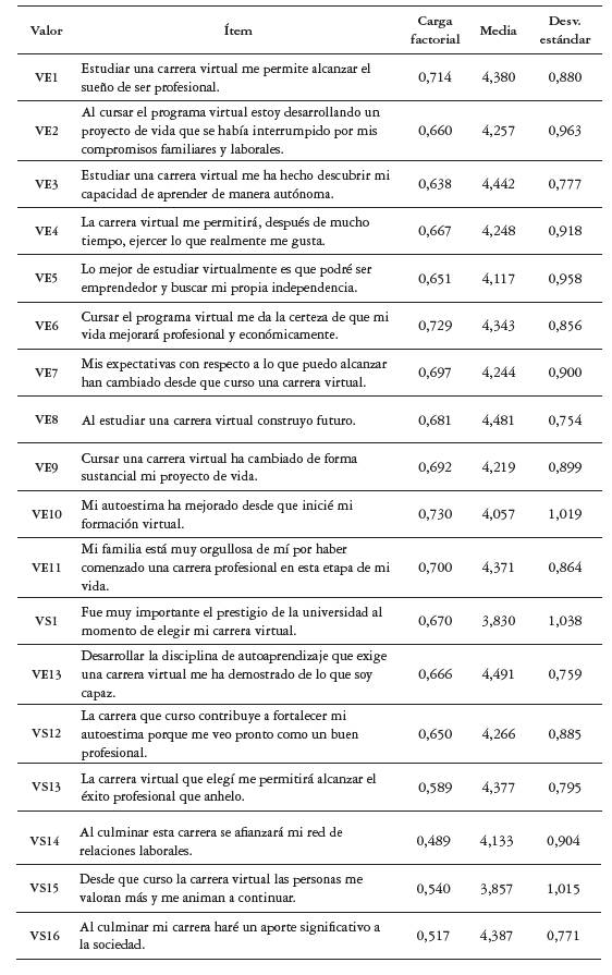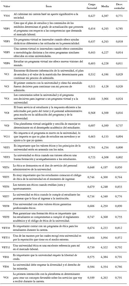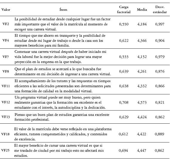 Al analizar el total de ítems de la escala se puede destacar que presentan mayor promedio aquellos agrupados en los valores "Ético condicional", "Socioemocional" y "Funcional". En el valor "Ético condicional" se destaca el respeto a la libertad de credo con 4,384, el cumplimiento del reglamento estudiantil y el código de ética con un 4,368. Con igual puntuación aparece el respeto por la diversidad y los derechos de las minorías. En el "Valor socioemocional" los mayores promedios se sitúan en los ítems que tienen que ver con el reto y las habilidades que supone la educación virtual (4,481-4,442), así como el sueño de ser profesional. Esto supone un aporte significativo del valor "Socioemocional" al valor percibido de los estudiantes de programas virtuales. El ítem con mayor promedio se encuentra en el "Valor funcional" con 4,573, el cual asigna la responsabilidad de la calidad de formación a la autodisciplina y dedicación al estudiante, lo que replantea en algunos aspectos las definiciones propias del "Valor funcional" para la educación superior y, en específico, para la educación virtual, pues trasciende el concepto de valor funcional encontrado en la revisión de literatura que se centra en la calidad en el desempeño del producto, sin intervención de quien lo consume. En este caso, el estudiante se considera parte fundamental de la calidad percibida del programa académico que cursa.