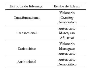 Aragón-Correa et al. (2007), García-Morales et al. (2012) y Chatterjee y Kulakli (2015) establecen que el liderazgo, desde una perspectiva transformacional, impacta de forma positiva en el aprendizaje organizativo. Si revisamos los elementos más importantes de este enfoque de liderazgo, es posible establecer que los estilos de dirigir más consistentes con el enfoque de liderazgo transformacional son: visionario, coaching, afiliativo y democrático.