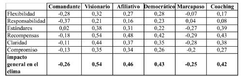 De acuerdo con la tabla 2, el estilo visionario tiene el efecto más positivo sobre el clima de trabajo y, por tanto, sobre el desempeño de la firma. No obstante, los estilos afiliativo, democrático y coaching le siguen muy de cerca. Esto indica que los directivos no deben depender exclusivamente de un estilo en particular, y todos tienen, al menos, usos de corto plazo (Goleman, 2005).