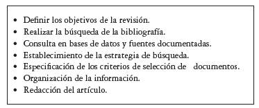 Con el fin de seguir un orden en el proceso de revisión documental se tuvo en cuenta la propuesta de Guirao, Olmedo y Ferrer (2008), quienes resumen en siete grandes etapas el desarrollo de dicha revisión.