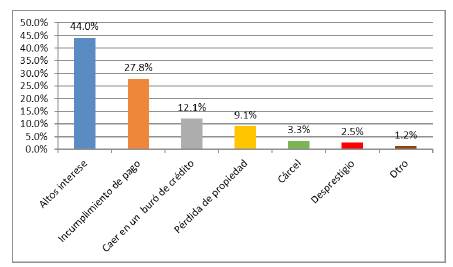 Por otra parte, al preguntar a las empresarias ¿qué le parece más riesgoso al pedir un crédito?, el 44 % consideraron que son los altos intereses que tienen que pagar, el 27,8 % que lo más riesgoso es el incumplimiento del pago y el 12,1 % le temen a caer en buró de crédito (figura 1).