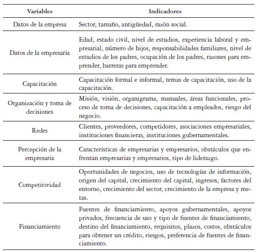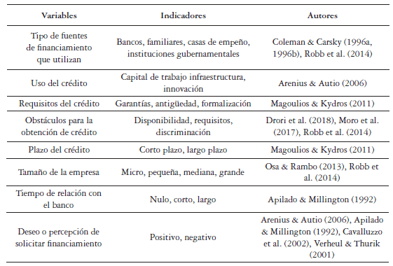 Según la revisión de la literatura realizada acerca del financiamiento de las pymes lideradas por mujeres, se elaboró la tabla 2 de variables e indicadores que sirvieron de base para construir el instrumento de recolección de datos.