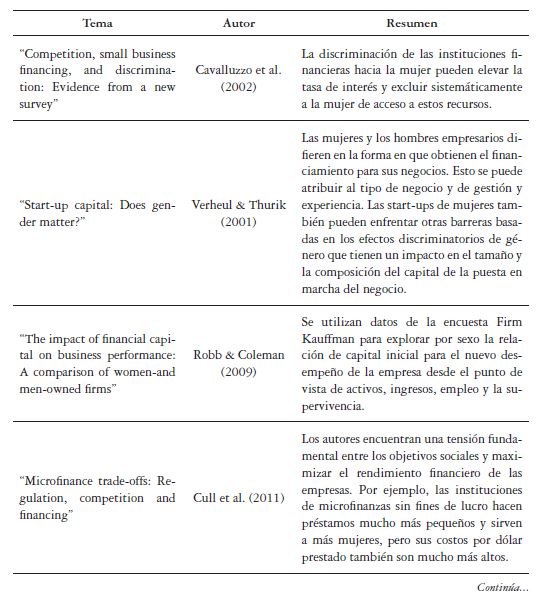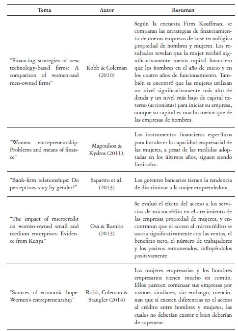 Se han realizado algunos estudios que han abordado el financiamiento de las pymes lideradas por mujeres. En la tabla 1, tabla 1b, tabla 1c se presenta un resumen de algunos de ellos.