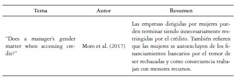Los estudios antecedentes acerca del financiamiento de las pymes lideradas por mujeres muestran que hombres y mujeres financian de forma diferente sus negocios y esto puede deberse al tipo de negocio a la experiencia e, incluso a la discriminación que sufre la empresaria por cuestión de género. Por esta razón, a pesar de los grandes esfuerzos para apoyarlas, ellas se ven obligadas a acudir a fuentes de financiamiento que solicitan menos requisitos, pero con altos costos como las microinancieras.